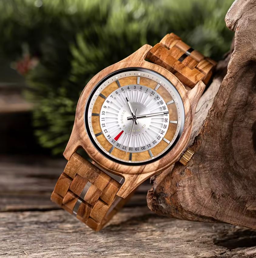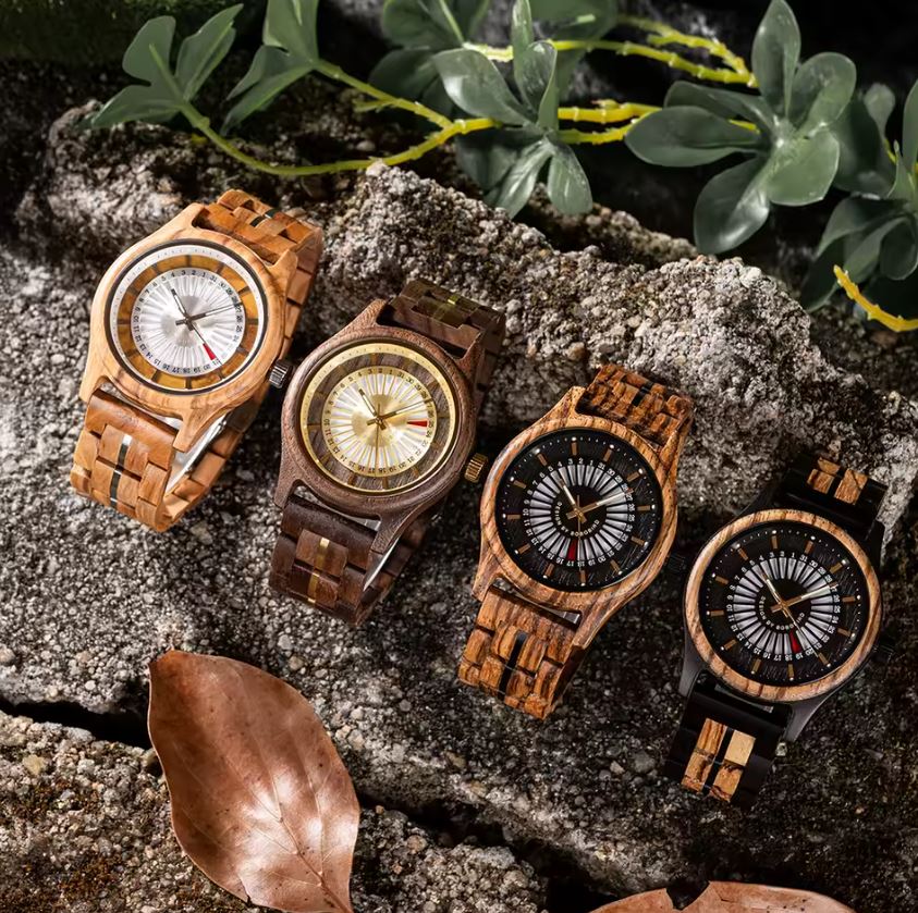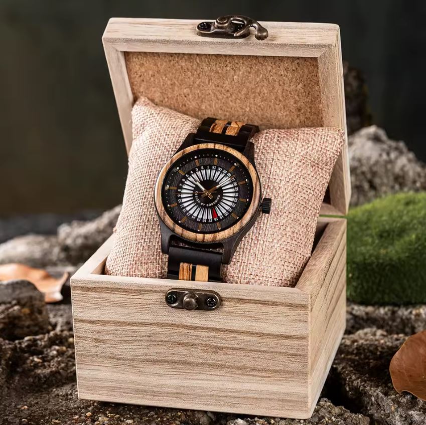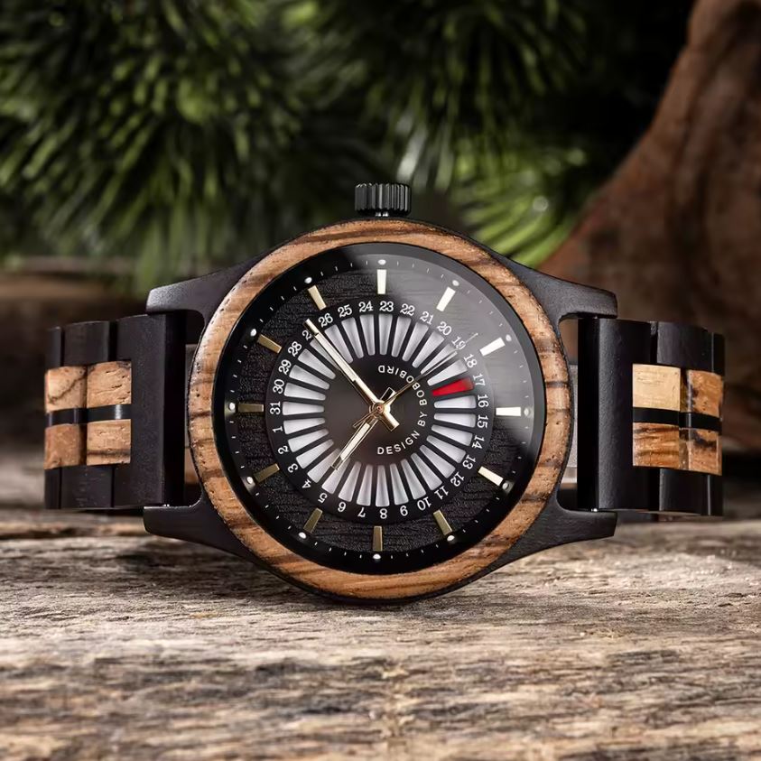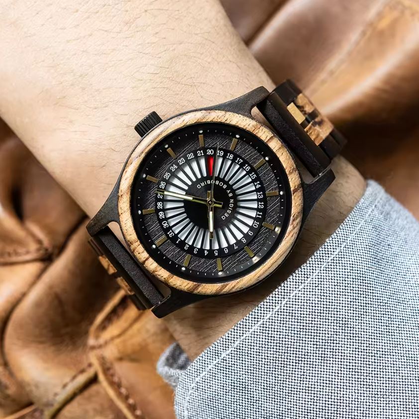 A seamless blend of nature and craftsmanship, this handcrafted wooden watch offers a fresh take on timekeeping with its radial dial and unique concentric display for both time and date. The rich wood grain, accented by a lighter bezel, highlights the beauty of natural materials in a modern form. Subtle details like the rotating center disc and minimalist markers add depth and intrigue to its design. More than a watch, it’s a quiet statement of character and elegance.